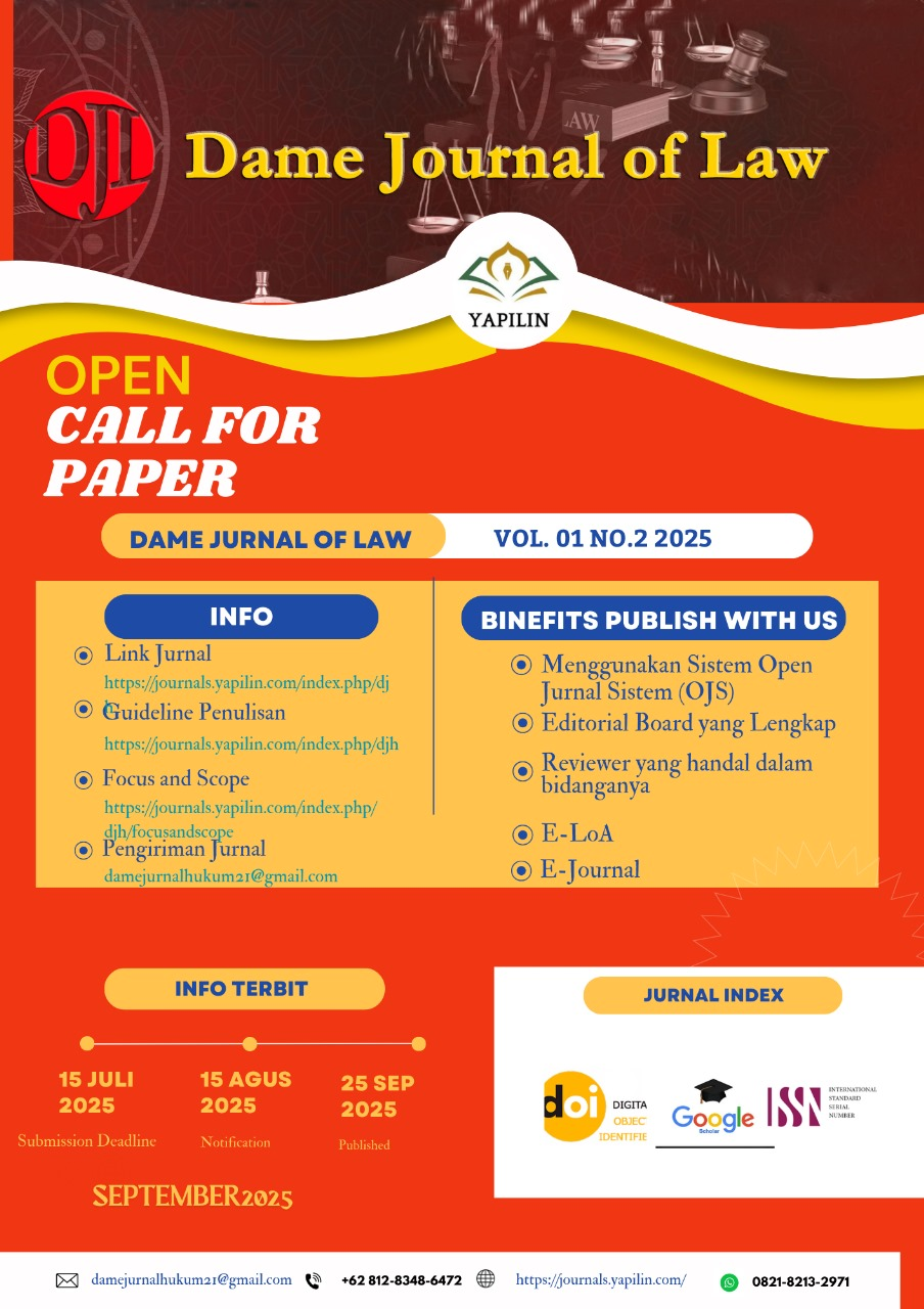 Yayasan Pesantren Islam Literasi Nusantara (YAPILIN) Jl. Sekolah Yapia Rt. 03 Rw. 04, Ds. Cidokom Kec. Gunung Sindur, Kab. Bogor, Jawa Barat, Indonesia, 16340 Phone: +62 812 8348 6472 e-mail: damejurnalhukum21@gmail.com |